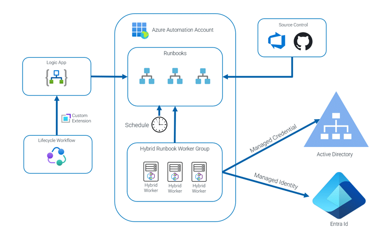Many enterprises still manage their user identities primarily on-premises. To implement complex lifecycle workflows for those identities requires the ability to execute tasks on-premises, one way to solving this problem is to use Azure Automation Hybrid Runbook Workers that are triggered by a Logic App configured as a custom extension task for Lifecycle workflows.