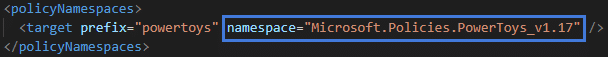 We can solve the versioning problem by making a small update to the admx and adml files. First, rename the files from PowerToys.admx to PowerToys_v1.17.admx and PowerToys.adml to PowerToys_v1.17.adml. Next, edit target namespace shown in Figure 1 and the string value shown in Figure 2 to include the version of the new ADMX template package.