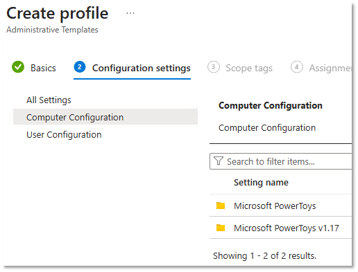 Once the edited ADMX templates have been uploaded to Intune successfully, you can create a new configuration profile using Administrative Templates. The ADMX templates you have uploaded will have edited names. Figure 3 shows how Intune displays the default PowerToys ADMX template and the edited ADMX template.