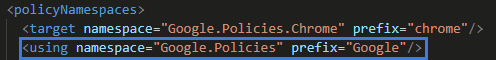 - Using Namespace: Contained under the <policyNamespaces> key within the .admx and references a parent namespace of which this template depends on, if applicable.