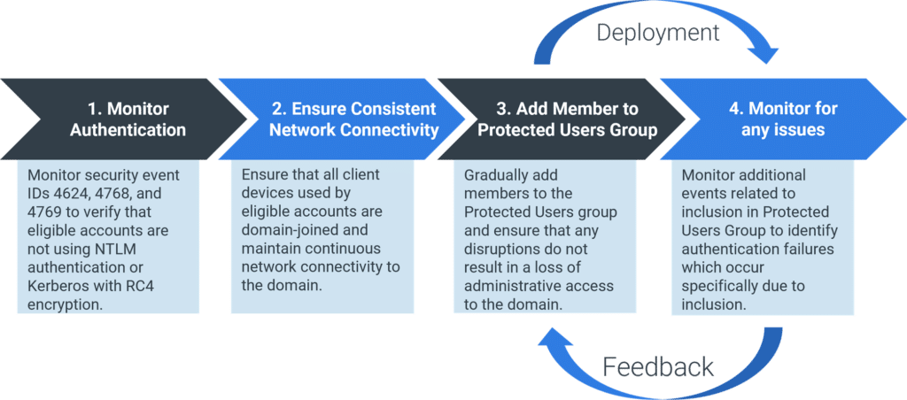 The successful implementation of the Protected Users group begins with monitoring authentication attempts for all eligible accounts, illustrated in step 1 of Figure 1. This involves auditing security Event IDs 4624, 4768, and 4769 to ensure that accounts do not rely on NTLM authentication or Kerberos with RC4 encryption: